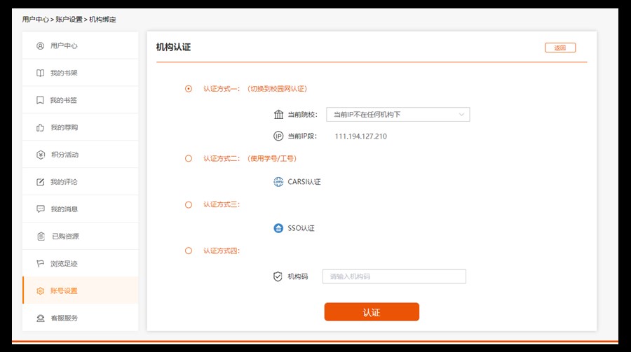 1、校内IP范围内的用户,进入“用户中心”点击“认证”,选择“认证方式一”,即可实现“IP认证”。用户IP认证后,每次享有最长90天的离校访问权限。