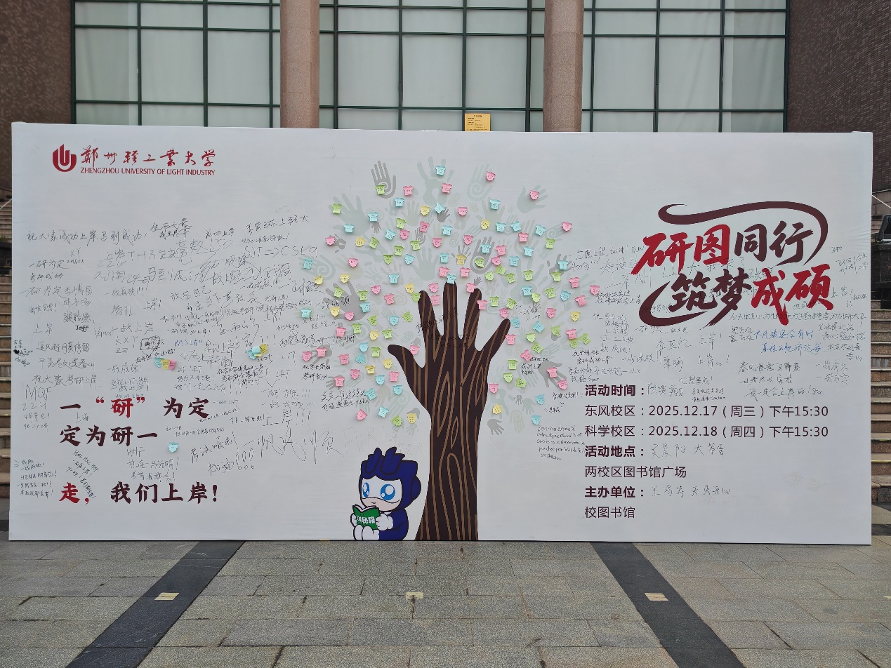 活动现场特别设置了以“研图同行,筑梦成硕”为主题的创意展板。展板设计为翻开的书本与成长的大树,树干上贴满了由图书馆老师和全校同学提前写下的祝福便利贴。