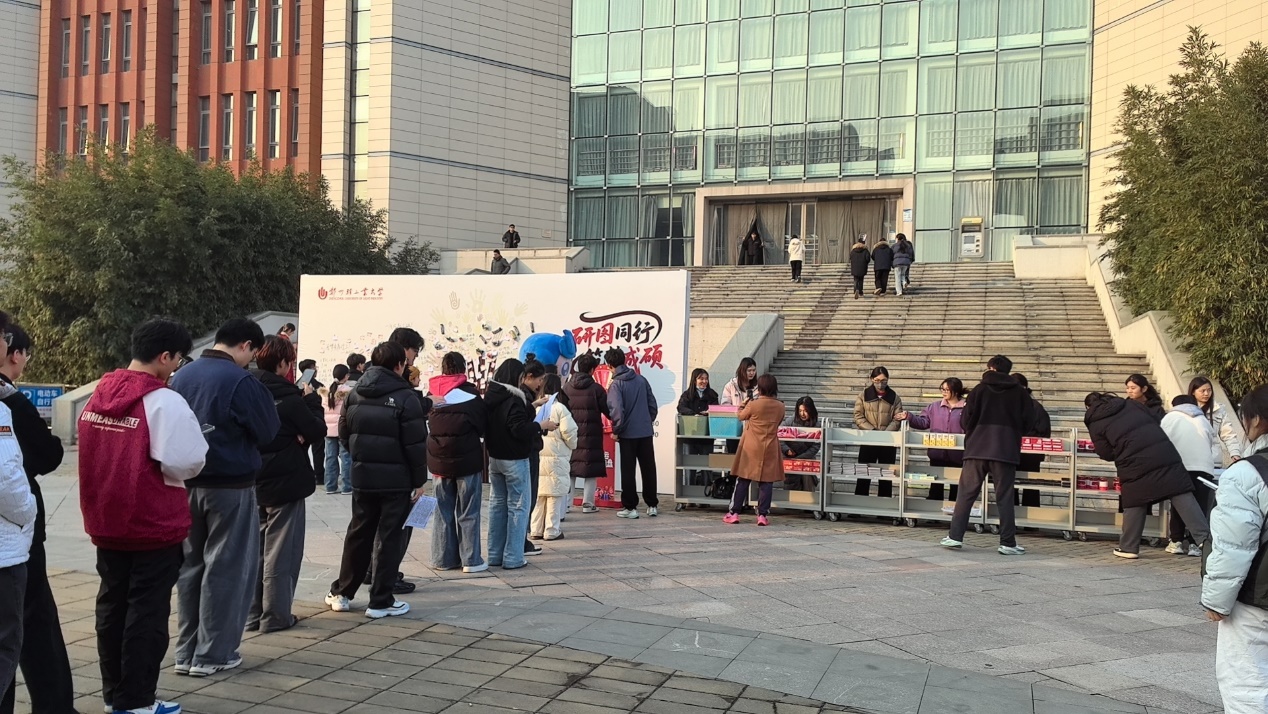 熟悉的“轻小图”玩偶再次现身,与考研学子温暖拥抱,以无声的行动驱散冬日寒意,注入坚持的勇气。活动现场气氛热烈而温馨,同学们在互动中短暂放松,彼此激励,凝聚起“一战成硕”的共识与信心。