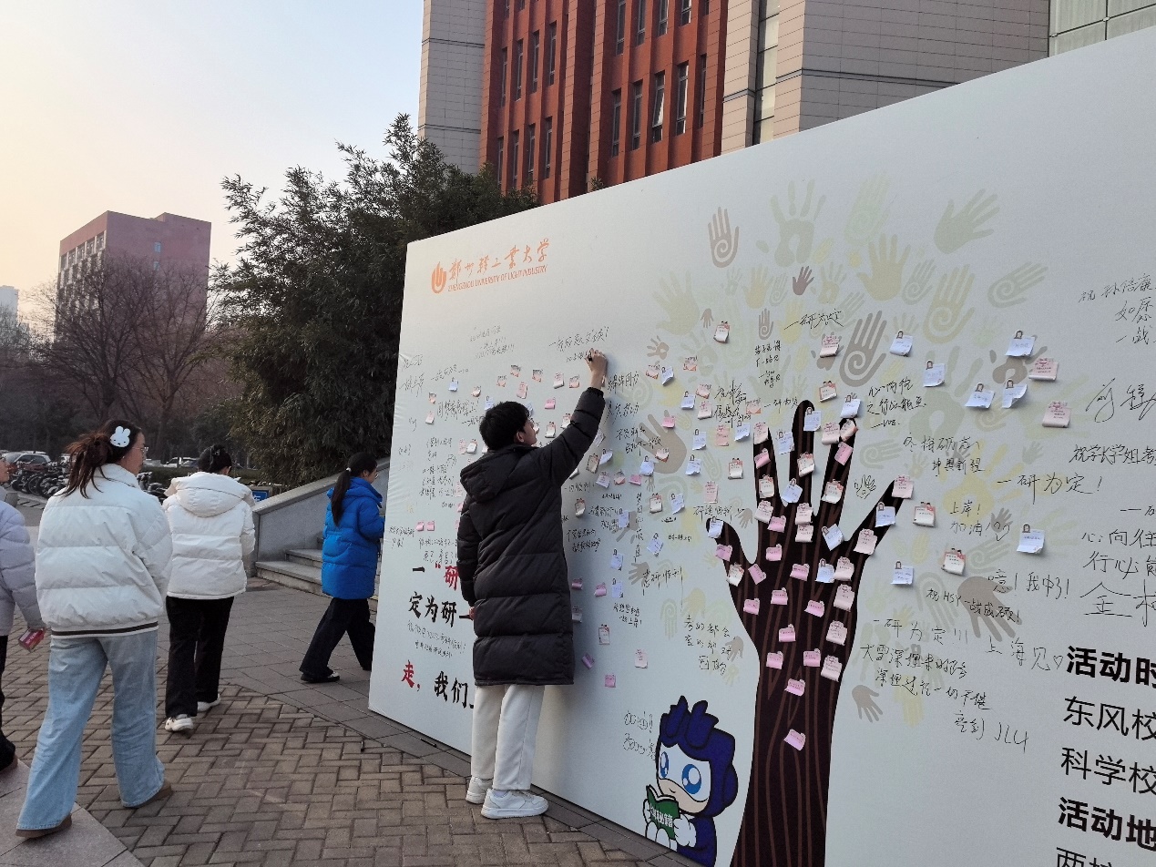考研学子们纷纷驻足,或写下心仪的目标院校张贴于“枝头”,或随机抽取一张承载着陌生却真诚鼓励的祝福签,收获一份暖心奖品与前行力量。定制的手持加油板也吸引了众多同学拍照留念,定格下考研路上这份特别的鼓舞。郑州轻工业大学图书馆视频号同步现场直播,吸引了近3000名观众收看。