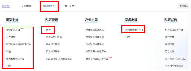 路径一:郑州轻工业大学图书馆主页—中文资源—万方数据知识服务平台——知识服务